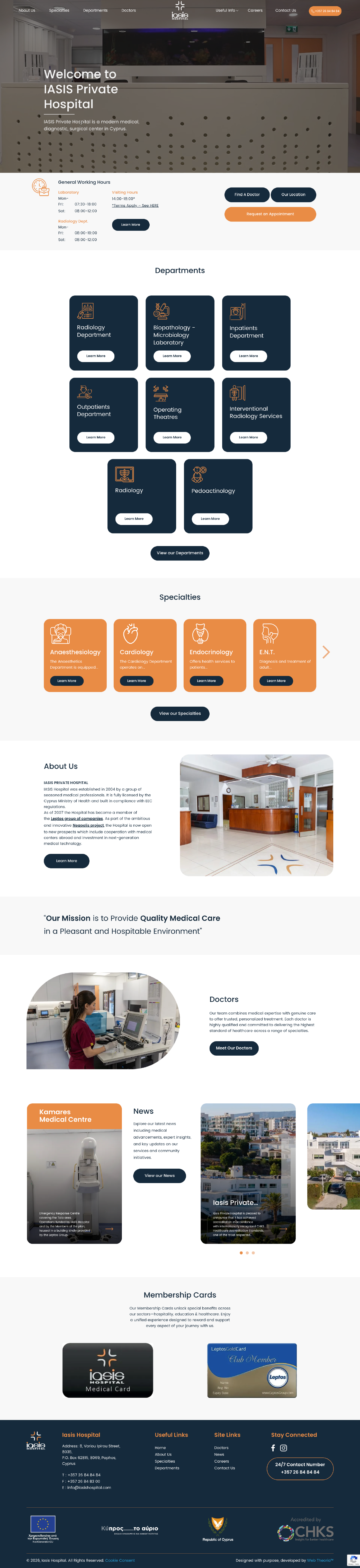 IASIS Private Hospital, located in Paphos and owned by the Leptos Group, is a fully licensed private hospital established in 2004. Built in accordance with EEC regulations, it offers comprehensive medical services, advanced facilities, and experienced healthcare professionals across inpatient and outpatient departments.